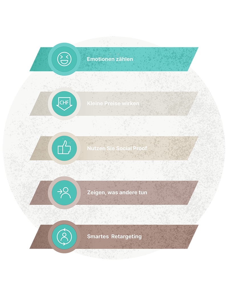 Online-Käufer fühlen sich eher von emotional stimulierenden Faktoren angesprochen. Sie schenken einem so präsentierten Produkt mehr Aufmerksamkeit und werten die Konkurrenz ab. In welche Kategorie fallen also Ihre Produkte? Lösen sie Emotionen aus? Oder haben Sie ihnen ein emotional anregendes Bild und Botschaften beigefügt? Führen Sie rigorose qualitative Forschung durch und ermitteln Sie den emotionalen Zustand der Besucher, die auf Ihrer Website ankommen! Sind sie verzweifelt oder gestresst auf der Suche nach der richtigen Lösung? So können Sie entweder den natürlichen emotionalen Zustand der Besucher ausnutzen oder ihn verändern, um sie zum Kauf zu bewegen. Konzentrieren Sie Ihre Energie auf das Schreiben von Texten, die einen effektiven emotionalen Appell darstellen! Passen Sie ausserdem Ihre Produktbilder, Schriftarten und Farben an, da diese einen unglaublichen emotionalen Wert besitzen. Seien Sie bei der Auswahl dieser Faktoren zielgerichtet und entschlossen!